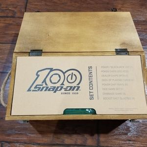Wooden box poker set, as pictured, by Snap-on. Brand new, never used. Box measures 18"x 9"x 9"