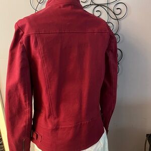 This stylish jacket will stand out in the crowd with its interesting cut and variation on styling for wear. Stand up collar, Pockets and side tabs on belted bottom to snug it up, if you like. Woven fabric. Just in time to sport for Valentine's Day! This is a blue-based red...think dark cherry