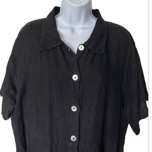 Snappy Turtle Delray Beach Fl shirt dress in black. Collared and shell button front. Shoe sleeves. Pockets. Buttons and tab at waist for more fitted silhouette. *** fabric care tag missing. 100% linen or linen blend. Bust 26” length 53”. Excellent pre owned condition. Snappy Turtle size 2 / Size XL