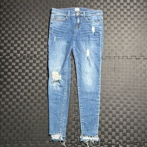 These blue ankle-cropped jeans from Sneak Peek feature a distressed design with frayed hems for a modern, edgy look. The slim fit and subtle fading patterns enhance their casual appeal, making them a versatile addition to any wardrobe.