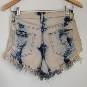 Trendy distressed denim shorts with a stylish frayed hem. Perfect for casual outings. Great pre-owned condition with minor stain that may come out with treatment. Not that noticeable. Size tag was removed.