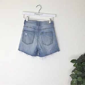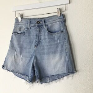 A pair of high waisted jean shorts. Light wash blue with fashion rips. Real pockets and belt loops.