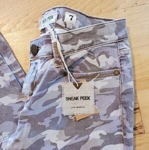 Sneak Peek Los Angeles skinny jeans. Size 7, 7.5" rise, 29" inseam, 10" bottom opening. Light, intentional faded Camo, 2 toned gray in color, front fly zip, stretchy material made of 98% cotton/2% spandex. Brand new with tags!