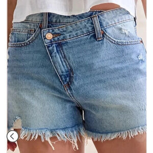 New with tags Sneak Peek Vivian asymmetric detail denim shorts in size Large. Distressed denim with frayed bottom. Made of 99% cotton and 1% spandex.