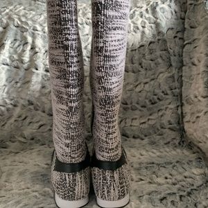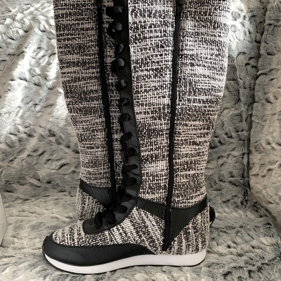 Tweed sneaker boots, knee-high with leatherette trim, lace-up vamp, and inner zipper closure finished with a cushioned footbed. Synthetic sole, man-made fabric.