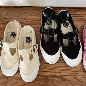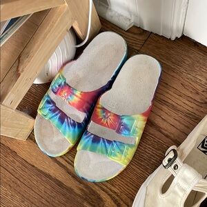 These are so cute! The vans have barely been worn although as you can see, I pushed the heels down. Maybe once or twice? Rainbow tie-dye Birkenstocks I think are the brand and the other sneakers are tie-dyed Superga. Yes, I dyed them myself.