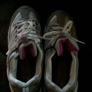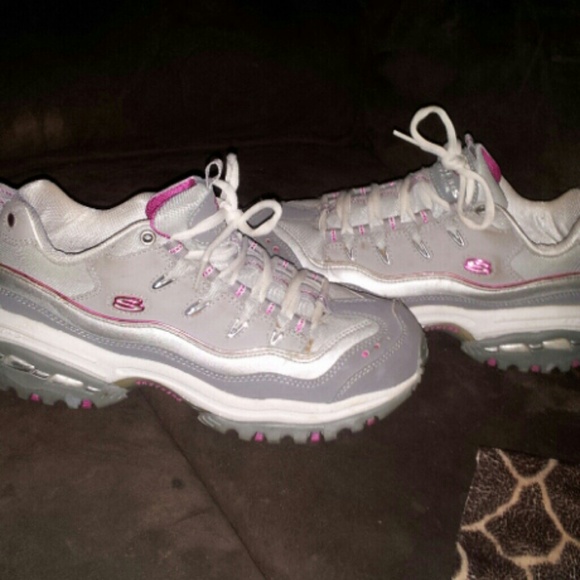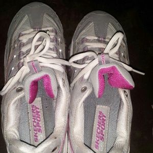 Sketchers comfortable grey white and pink . Lightly worn. In love but they are too small