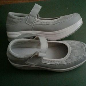 Never worn size 38 which would be a size 8. Gray and white sneakers, No brandname.Velcro enclosure.