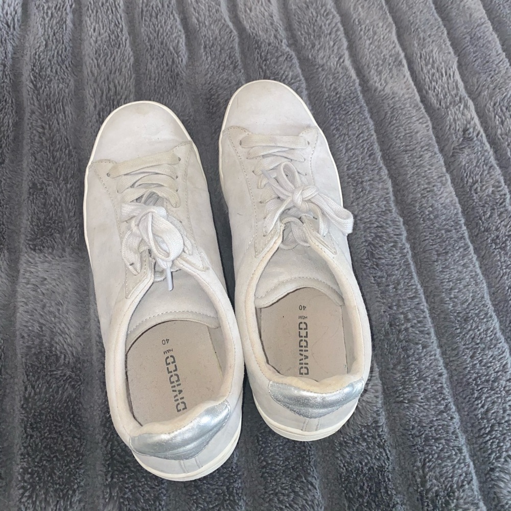 H & m brand sneakers, suede, everyday wear, metallic backing, light blue grey color