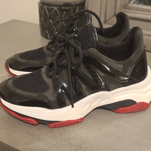 Camouflage, black,black, and white Steve Madden sneakers size 7 1/2M. Mesh front.