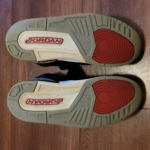 Used/worn Gray & Black Cement Jordan 3 w/Spike Lee face & 40/a mule symbols. Good condition size 9 1/2.
