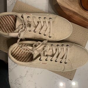 Color beige I use one time only o they look like new no any stain I use for very short mine size 9 or 40 . The bran is Toas