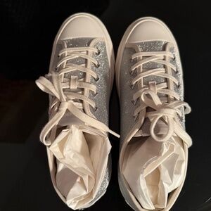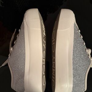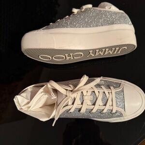 The product is a pair of women’s sneakers in size 39 1/2(UK),or9,5(US). Manufactured in 2025, these stylish sneakers feature glitter accents and a mid - top shoe shaft style. Made of leather with a comfortable rubber outsole, they are designed for casual occasions and offer a unique silver color. The Jimmy Choo brand adds luxury and the model, Palma Maxi, is customized for a colorful and eye-catching look. Made in Italy, these athletic shoes are both fashionable and functional for the modern women.