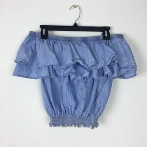 Sneak peek cropped top with double ruffle at the top. Thick elastic around the top and shirred elastic at the bottom Full bodice.