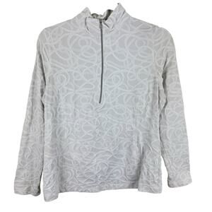 Has a small blue spot on front & some blue spots on back of cuff of left sleeve. White textured long sleeve mock neck 1/2 zip stretchy pullover base layer top. Nylon/spandex material. Approx. measurements: Shoulder to hem 25", pit to pit 19", sleeve from neck to sleeve hem 27". Size M.