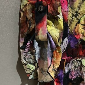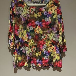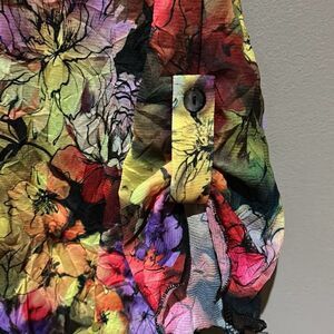 This is an XL Sno Skins blouse with sleeves that can be worn down or buttoned up. Made in USA of 100% Polyester. From Fall/Winter collection in a blend of purple, green, yellow, and reds. P2P 22” and length is 24”. In like new collection.