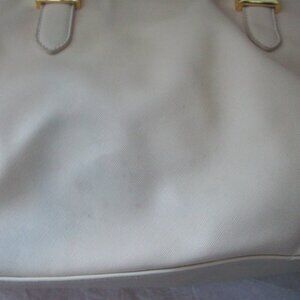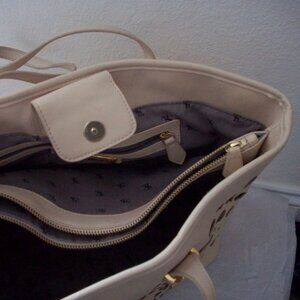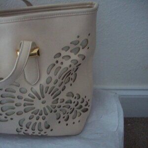 Snob Essentials Butterfly cut in the Fabric with gold print. Shoulder bag. Three compartment's with zipper middle. Zipper pouch on one side, Cell phone holder, glasses holder on the other side. Off White in color with Gold print butterfly and detail. 9"inch shoulder drop, 16 " W X 10" H x 13" inch deep. The bag does have a light dirty spot on back of bag. There is a picture above. Other than that in Excellent Condition. Comes from a Smoke Free Home.