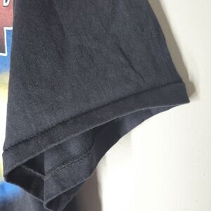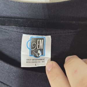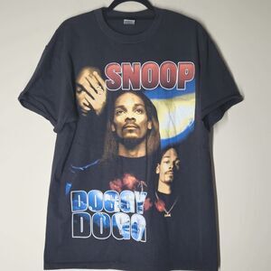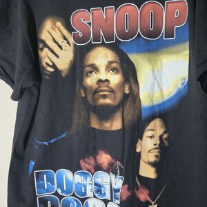 This is a Snoop Dogg Tha Doggfather rap t-shirt in size Large. The shirt features graphic prints of Snoop Dogg, Ice Cube, Eminem, and Dr. Dre, with a crew neck and short sleeves. Made of black cotton material, it has a vintage design with logos and is machine washable. The t-shirt is a limited edition item from the brand Gem, with a modern boot tag on both sides, perfect for fans of 90s and 00s hip hop music.