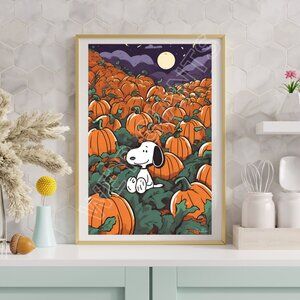 Get into the Halloween spirit with this 11"x17" art print featuring Snoopy. The print is perfect for any art lover and Snoopy lovers. The theme of the print is Halloween and it features a pumpkin and fall season elements. Halloween lovers will adore the intricate details and the use of vibrant colors. Add this print to your art collection today!