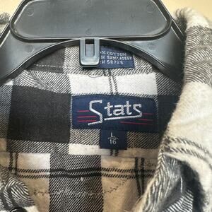 Upcycled plaid flannel with Snoopy Joe Cool So Awesome it hurts graphic applique on the back. Brand: Stats