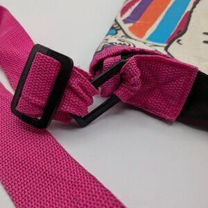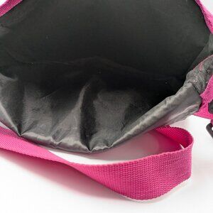 Adorable Snoopy Peanuts messenger-style bag from 2015, featuring a black design with pink trim, pink adjustable strap, and a vibrant rainbow heart graphic. Perfect for kids, this bag has a velcro closure for easy access. Pre-owned and showing wear from age and use, including some pulls, stains, and cracks in the graphic as shown in images. A fun and functional piece for any Peanuts fan!
