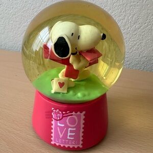 Charming Snoopy snow globe with a love letter theme. Features vibrant red and green colors.