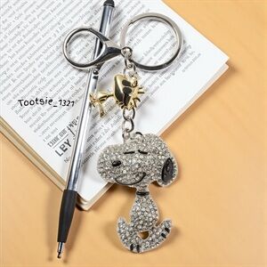 Sparkling Snoopy keychain with rhinestones. Features a cute design with black and silver tones.