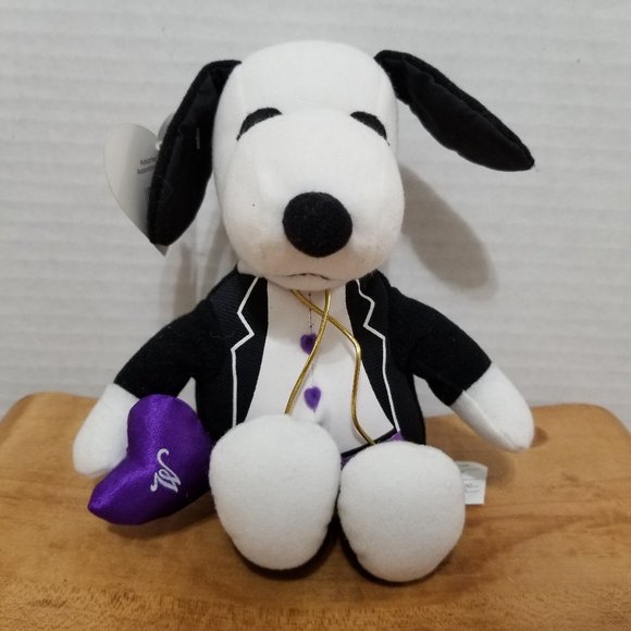 Snoopy wearing a tuxedo & holding a W heart plush stuffed animal. Measures approximately 6 1/2 inches from top of head to bottom. Straps on front to attach a Whitman's chocolate box. (No box or candy included, sorry!)