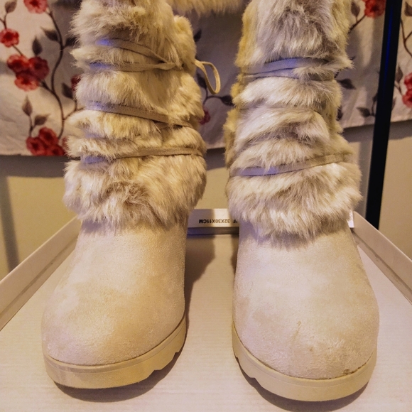 Furry threw out the booty, Fur on the outside, String with two balls at the end, Wedge heel. Never worn just tried on