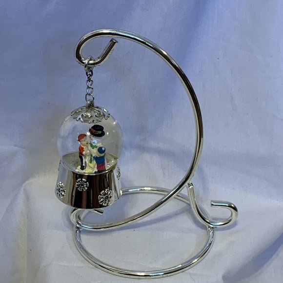 Snow Globe Features Two People Attending to a Snowman. Silver Base is Embellished with Snowflakes. Snow Globe is 3 inches tall. Total hieght is 6 1/2" tall. White snow floats when shaken. Used in very good condition. See pictures sold as is. No Box.