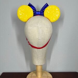 Featuring dazzling yellow sequin ears with blue and red glitter details and sparkling rhinestones, these Disney-inspired headbands are crowned with a shiny metallic blue fabric bow, accented with red and gold rhinestones for a touch of royal elegance. Perfect for fans of the classic princess, these ears will make your Disney day truly magical! 👑🌹