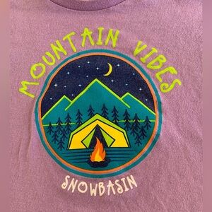 This cute souvenir T-shirt is from Snow Basin Ski resort in Utah. It’s heavy durable cotton. A girl’s size large. It’s got a cute camping graphic and is in good used condition.