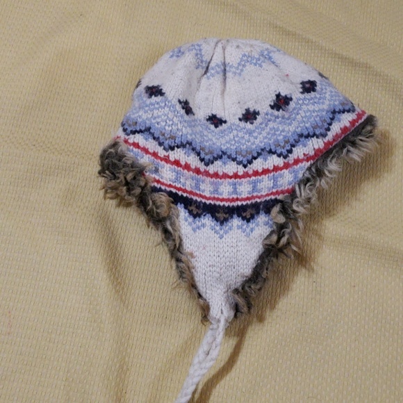 White with blue black and red pattern.. faux fur inside ear flaps -shrunk from washing- still fits adult size though