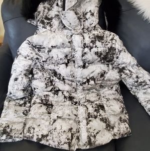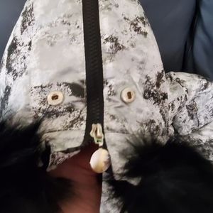 Black and white snow jacket with detachable faux fur on hood