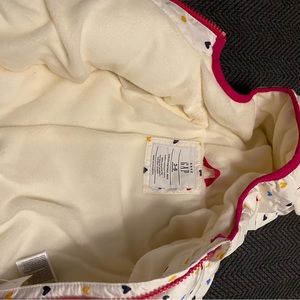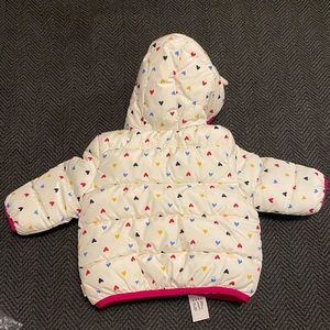 Snow colorful jacket. Will make your LO looks adorable with this heart print. Perfect for outdoors family pictures. Is great for the snow and winter. Inside is cozy and warm and outside material looks like water resistant. New with tags. Never used.