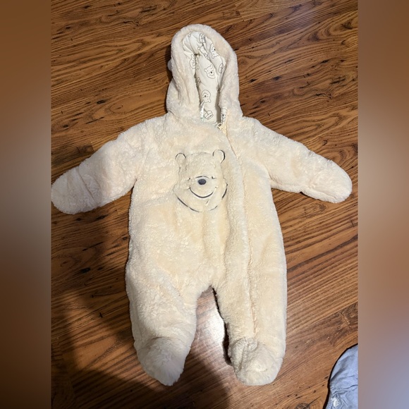 Fuzzy Pooh bear snow suit. Not waterproof but keeps baby warm. Inside is a cotton type of fabric