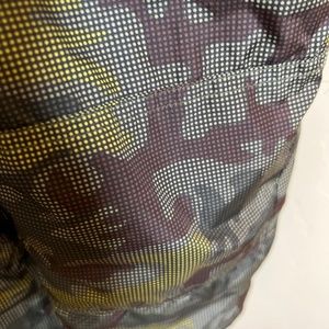 Color: Green camouflage print with bright orange zipper