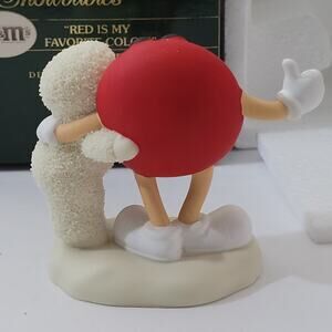 This adorable Snowbaby figurine features a classic all-white Snowbaby paired with a charming red M&M character. The M&M is dressed in cute white shoes and gloves and proudly declares, "Red Is My Favorite Color."