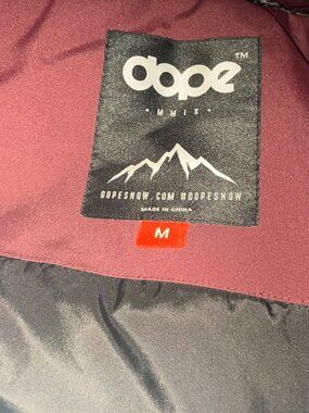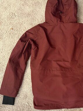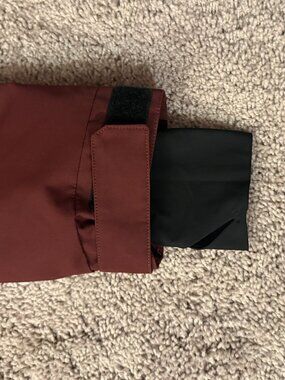 Only worn 2 times!! No rips! Color is maroon. This jacket is zip up with velcro to cover the zipper. It also has hand sleeves that extend from the cuffs, breathable armpits, and pockets!
