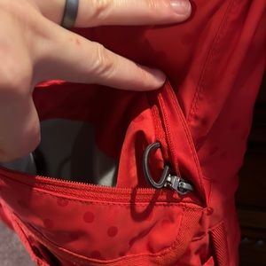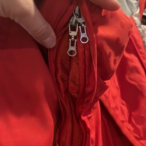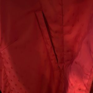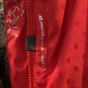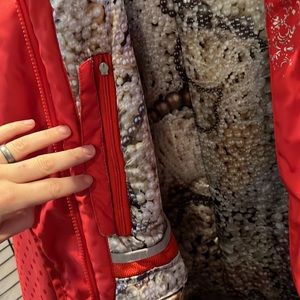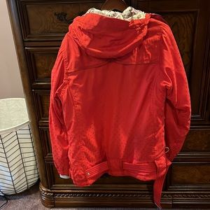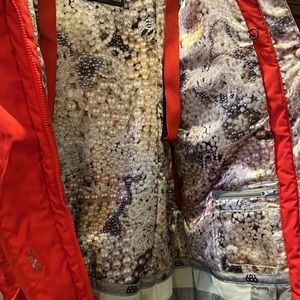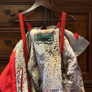 686 women’s snowboard jacket. Lots of pockets! Inside suspenders to keep jacket on to cool off without taking it fully off. Pants connector band if pairing with 686 pants. Double underarm zippers. All zippers, buttons, snap buttons and pockets are functional.