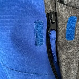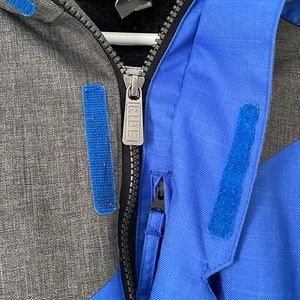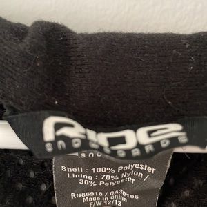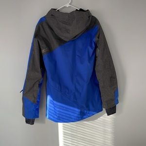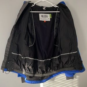 Snow sports jacket from Ride. The liner snaps to help keep the cold and wet out while a breathable mesh keeps you cool inside. All the pockets and front closure zippers are weather protected with velcro. The jacket shows minimal cosmetic wear but is still ready to hit the slopes with no holes or major damage.