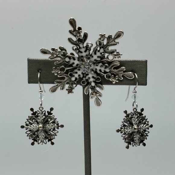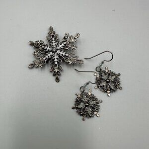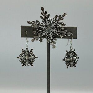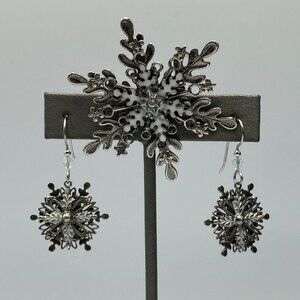 Snowflake Brooch Earring Set Silver Tone Winter Holiday Christmas Theme Jewelry