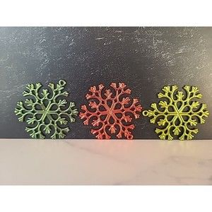 This is a lot of 19 snowflake shaped Christmas ornaments in red and different shades of green.