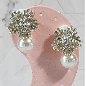 Snowflake Design Rhinestone and Faux Pearl Stud Earrings Gold Tone Metal Pretty