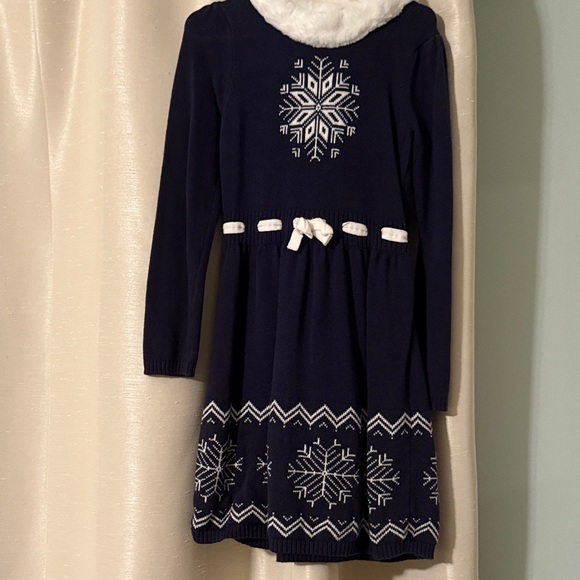 Elegant navy dress with snowflake pattern. Soft knit fabric with faux fur. Perfect for formal occasions — or visiting Santa or the Nutcracker.