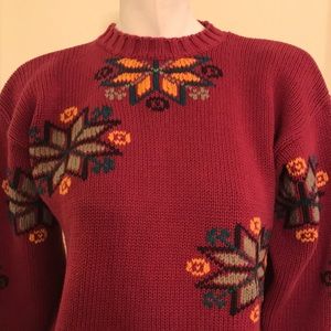 Cranberry cotton crew neck pull over by Eddie Bauer, w/ green/gold/black snowflake like designs, as seen in photos. Ribbed crew neck, cuffs & hem.