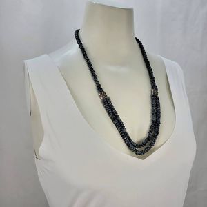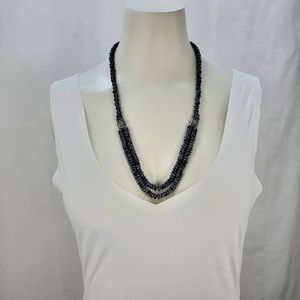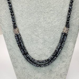 Handmade with beautiful black & grey snowflake obsidian natural stones in round & rondelle beads. Accented with an ornate silver spacer on each side. Figure-8 loop & hook closure. Approx 12" (no extender). A quality artisan piece that is unique, versatile, & timeless. In very good condition with no flaws detected.