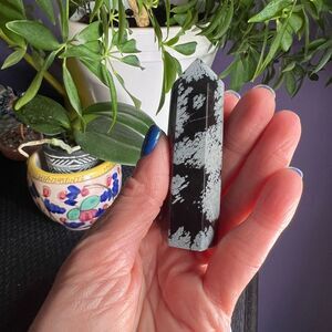 The snowflake obsidian crystal tower is a striking combination of black obsidian with white snowflake-like inclusions. Its metaphysical properties are believed to aid in balancing body, mind, and spirit, promoting inner reflection, grounding, and protection. It is said to assist in releasing negative energy and patterns, fostering clarity, and stimulating growth.