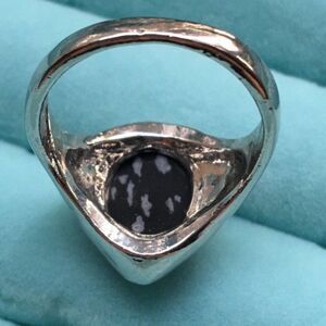 This silver-tone ring features a beautiful black, oval, snowflake obsidian (volcanic glass) cabochon stone. It shows light wear, mostly light scuffing, but is still in great condition. The ring measures approximately a US size 7.75.