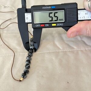Snowflake Obsidian, 10 round stones on choker/necklace w/brown woven cord & a gold tone bead at either end of the stones. Silver tone lobster clasp & extension chain. 14” - 16” long. Excellent condition.